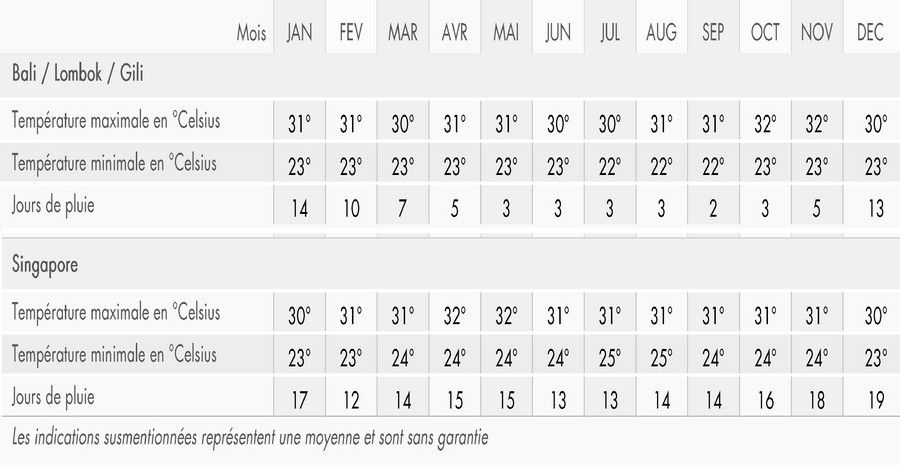 Toute l'année, les températures diurnes tropicales humides prévalent autour de 28 à 30 °. La saison idéale pour un voyage pour Bali avec beaucoup de soleil et peu de précipitations se situe d'avril à octobre. Par conséquent, les randonnées dans les rizières en terrasse et les montagnes situées à l'intérieur du pays se font dans les meilleures conditions. Si vous visitez Bali en octobre, vous pouvez par exemple planifier diverses excursions sans vous soucier des pluies tropicales. Mais même Bali en décembre mérite une visite. Durant la saison des pluies (généralement de courte durée) la pluie se présente principalement sous forme de courtes et fortes averses.
