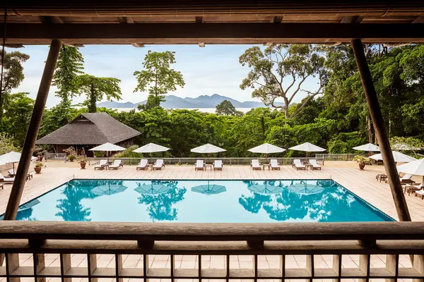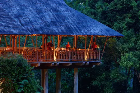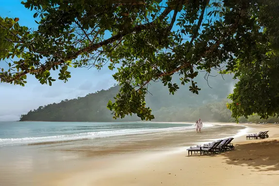 The Datai ne fait rien comme les autres. Ici, l’édifice principal s’amarre en terrasse, à 300 m du rivage, au cœur même de la jungle. Sa construction a été conduite avec prudence: pas de bulldozers, rien que des éléphants, pour préserver le plus de forêt possible. C’est là que s’implante le cœur de l’établissement et ses beaux bassins de lotus, avec vue sur la mer des Andamans, là que se dessine la piscine principale dans sa clairière ensoleillée (une autre est réservée aux adultes), là encore que s’ouvre la terrasse du Dining Room (cuisine occidentale et malaise) — d’où l’on peut observer, en saison, les calaos géants se nourrir des fruits des figuiers étrangleurs. Le spectaculaire Pavilion, servant une authentique cuisine thaï, se perche, lui, sur des pilotis de 30 m, toisant ainsi la canopée, tandis que The Gulai House, maintes fois primé pour sa gastronomie malaise et indienne, se niche dans une maison traditionnelle malaise en bois baignée des sons de la forêt. Côté mer, on trouve le très apprécié Beach Club, grand ouvert sur la plage et le large. L’hôtel possède en outre une bibliothèque, une boutique et le nouveau Nature Centre, dédié à cet écosystème précieux enveloppant The Datai, où vivent des singes